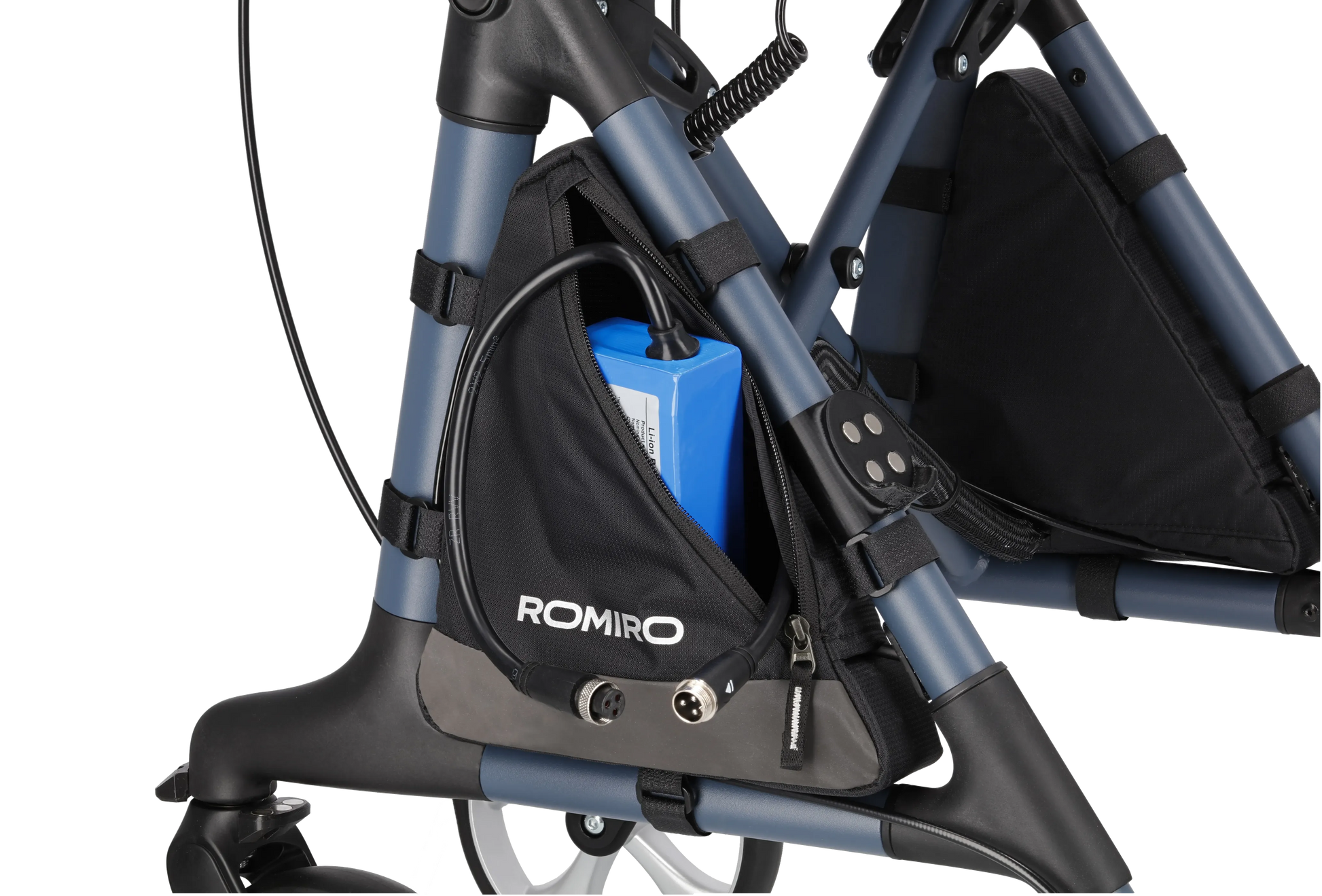 Besonders praktisch: Der Akku kann separat in der Wohnung geladen werden – ohne den Rollator in die Wohnung tragen zu müssen. Selbstverständlich ist auch das Laden möglich, während der Akku im Romiro verbaut bleibt.