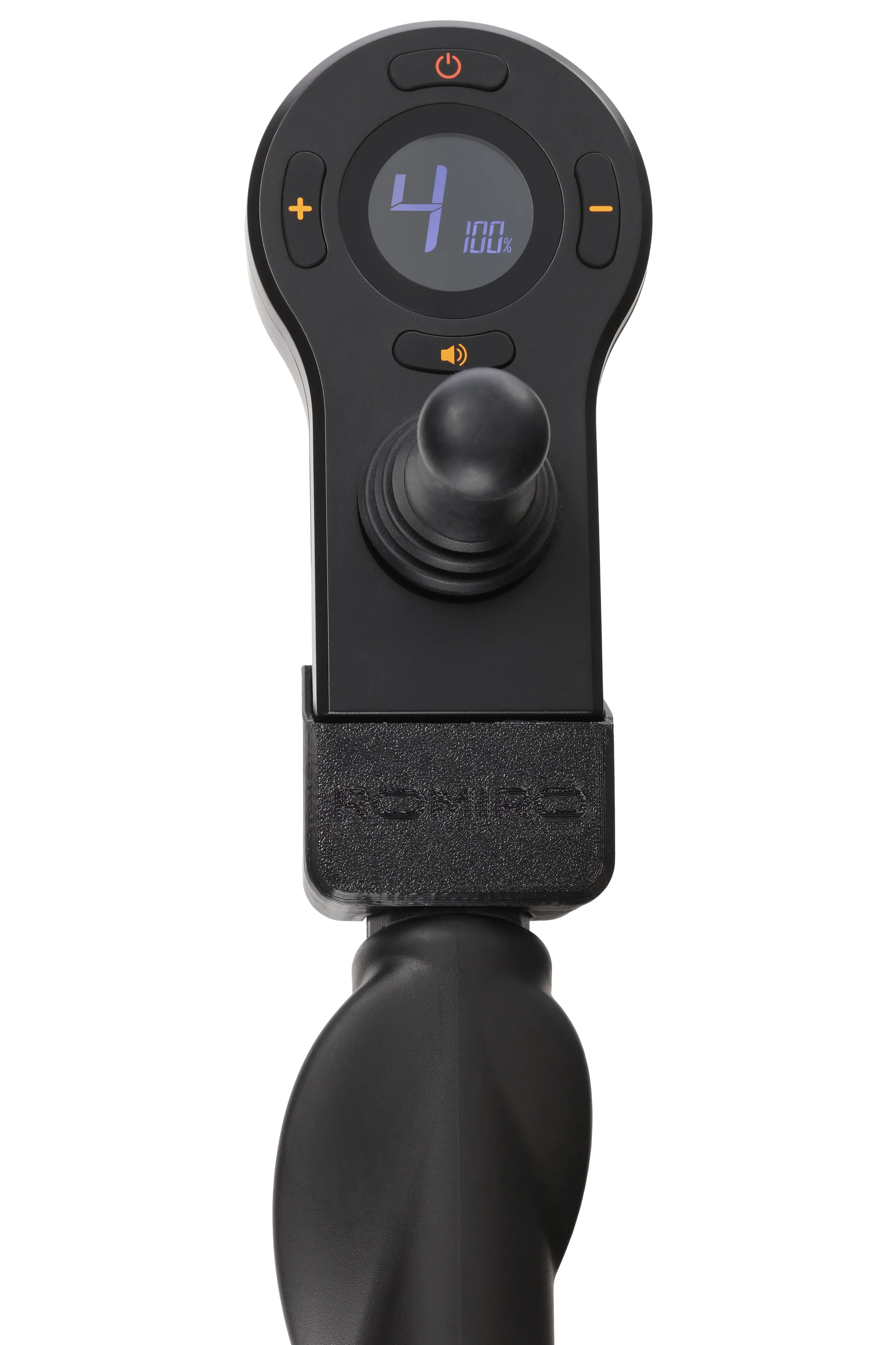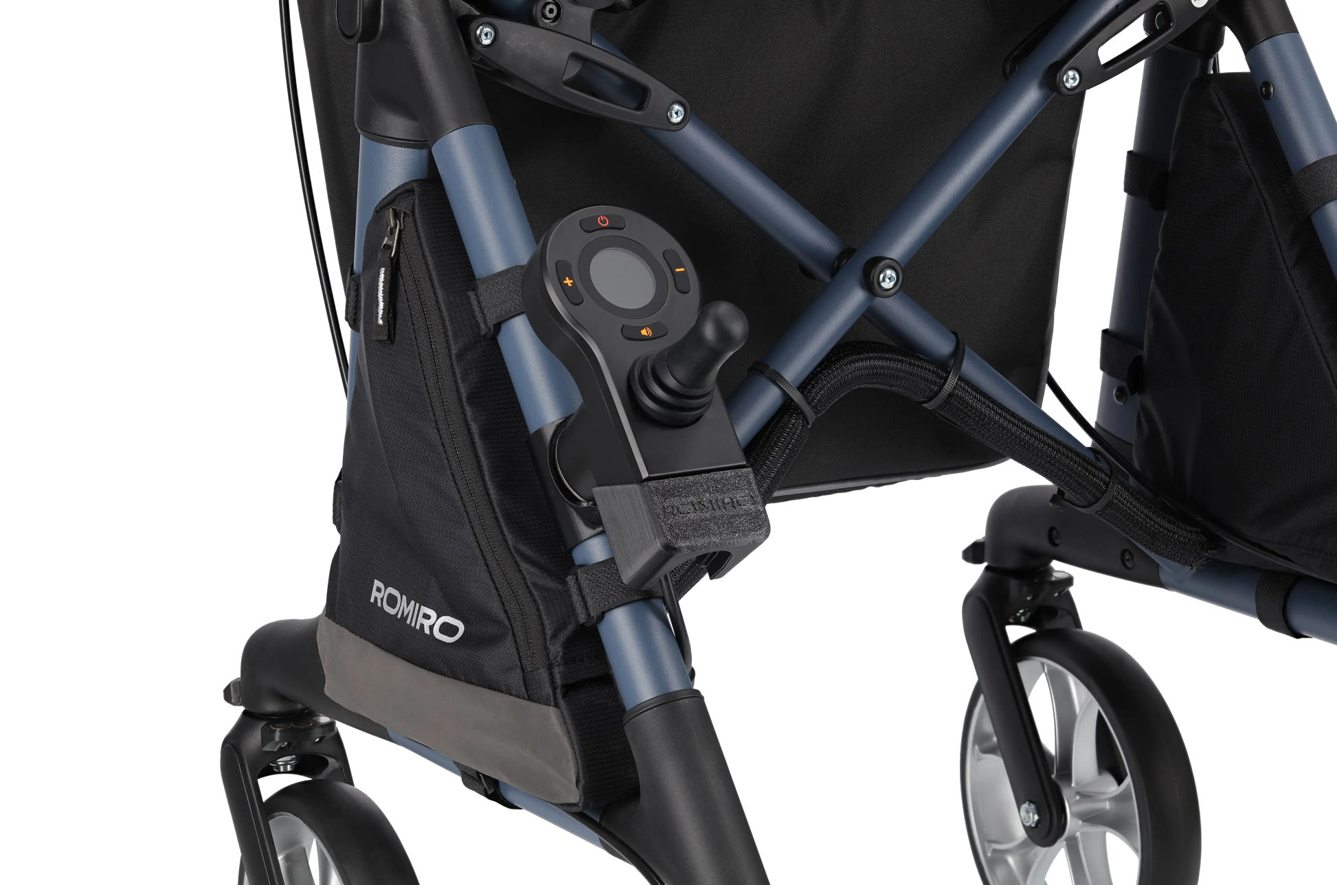 Romiro bietet zwei klar getrennte Bedienkonzepte – je nachdem, was im Alltag gerade gebraucht wird: eine Bedieneinheit zum Fahren (z. B. im Sitzen) und eine separate Schiebe-Steuerung für die Unterstützung beim Gehen.