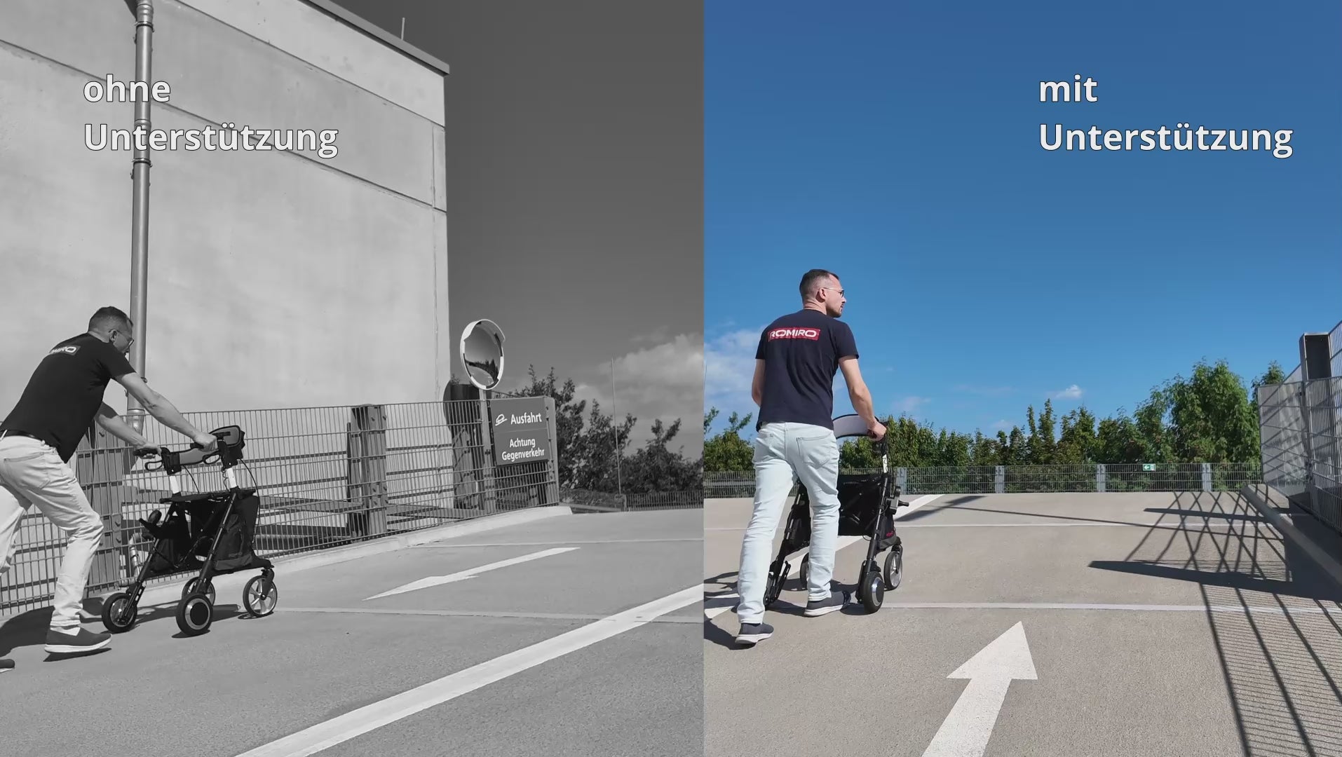 Im Video steht der Romiro im ausgeschalteten Zustand bewusst symbolisch für Rollatoren ohne elektrische Unterstützung: Wenn die Stützfunktion plötzlich „weg“ ist, entsteht ein erhebliches Sicherheitsrisiko.